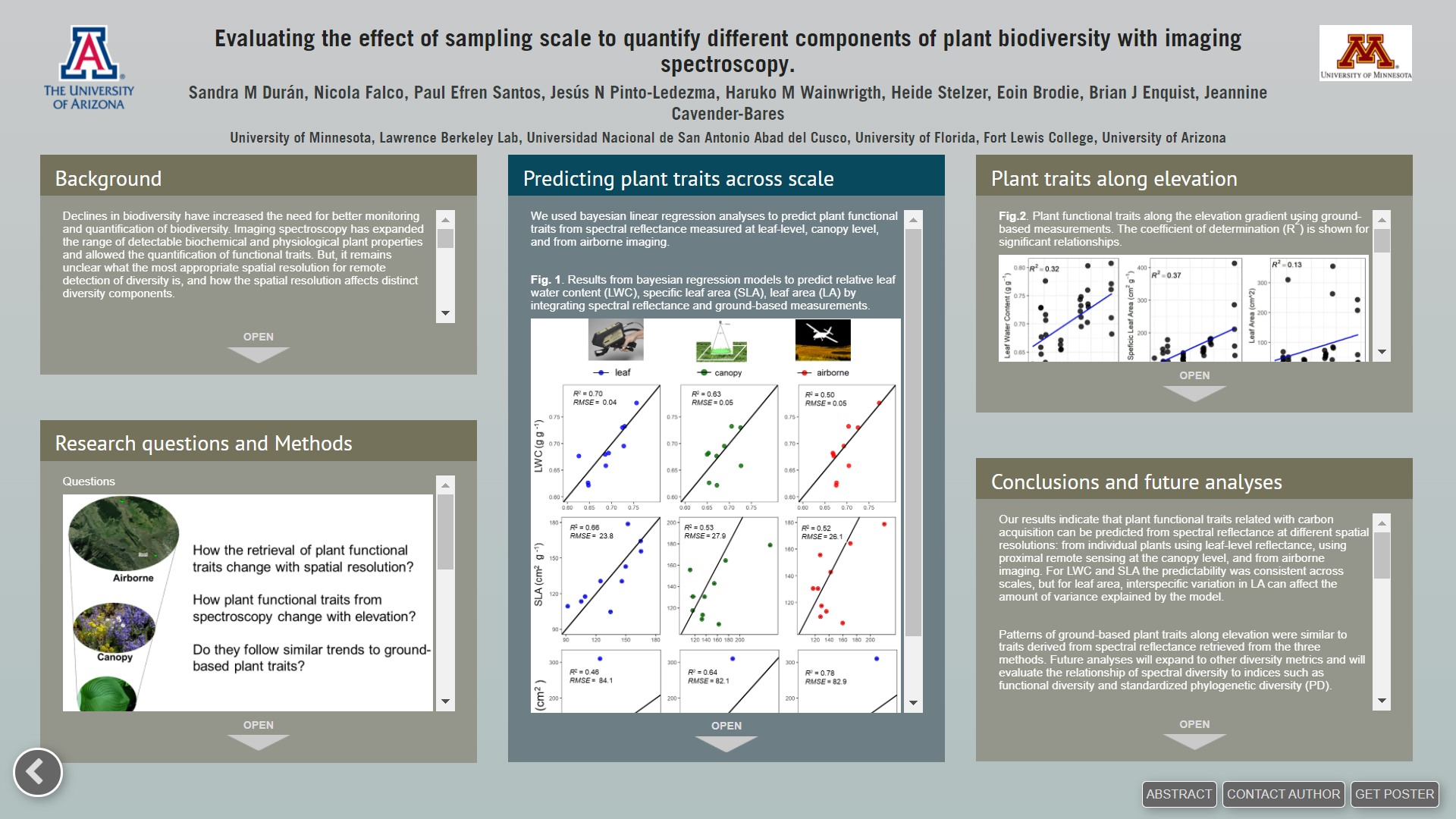 Declines in biodiversity have increased the need for better monitoring and quantification of biodiversity. Remote sensing has been used to assess the extent of natural ecosystems and has become an efficient approach to quantify plant biodiversity at larger spatial scales. Imaging spectroscopy have made it possible to quantify plant diversity at high spatial resolution, and has expanded the range of detectable biochemical and physiological plant properties and allowed the quantification of functional traits. Nonetheless, it remains unclear what the most appropriate spatial resolution for remote detection of diversity is, and how the spatial resolution affects distinct diversity components. We quantified three diversity components of plant communities at three different scales in alpine meadows along the East River watershed in Colorado. Our evaluation of scale focuses on variation in the spatial grain (or pixel) rather than the extent of the study area. Specifically, we estimated spectral, functional, and phylogenetic diversity from imaging spectroscopy at the level of leaf, canopy, and from airborne imaging. Diversity for the three components–i.e., functional, phylogenetic, and spectral–was estimated using distance-based metrics. We also evaluated the relationship between diversity metrics derived from spectra and from field-based methods with the long term aim of discerning the most generalizable metrics across scales. Overall, our results in Colorado showed a strong scale-dependency on the relationship between field-based diversity indices and diversity metrics from reflectance as has been found in experimental systems. Spectral diversity calculated at the leaf-level correlates strongly with spectral diversity at the canopy level, but only weakly predicts spectral diversity calculated from airborne imagery (1 m resolution). Three diversity metrics were able to explain variation in plant responses to changes in temperature, precipitation and evapotranspiration along the elevation gradient. Our findings highlight the importance of assessing the scale dependency of diversity metrics derived from spectra to understand plant responses to environmental gradients and improve the remote detection of diversity from imaging spectroscopy.